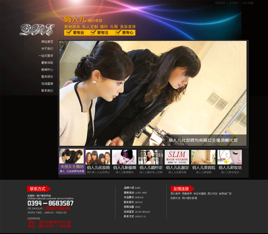 案例介紹:俏人兒是周口區(qū)域唯一一家專業(yè)于新娘化妝的形象設(shè)計(jì)中心。十七年來,俏人兒以自己的嫻熟技藝和真誠(chéng)服務(wù),針對(duì)每一張臉型、膚色、衣著等進(jìn)行個(gè)性化美妝設(shè)計(jì),配合最新潮、最全款式和檔次的婚紗選擇,總能送給每一位姊妹美倫美奐的扮妝體驗(yàn),為當(dāng)?shù)啬酥羾?guó)內(nèi)外無數(shù)姊妹塑造了一張張強(qiáng)視覺沖擊力的化妝作品,為每一位走進(jìn)婚禮殿堂的新娘留下永生精彩的一頁(yè),打造了周口地區(qū)化妝界的一張名片。
